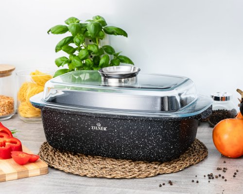 Brytfanna ZL-7013 to funkcjonalne naczynie kuchenne, które łączy cechy garnka i patelni, umożliwiając przygotowywanie różnorodnych potraw. Wykonana z trwałego stopu aluminium, posiada nieprzywierającą powłokę marmurową, która ułatwia gotowanie z minimalną ilością tłuszczu oraz zapobiega przywieraniu i przypalaniu potraw.