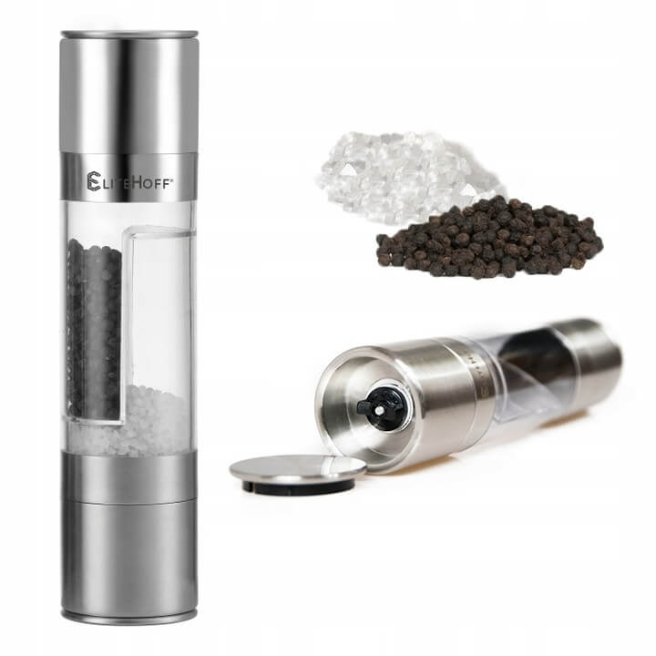 – Młynek EliteHoff został wyposażony w 2 przezroczyste zbiorniki (jeden na sól, drugi na pieprz)