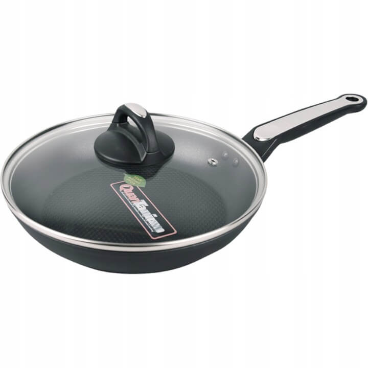 Patelnia MR-1207-24 cm została wykonana z odlewu aluminium i ma nowoczesny design. Obecność tytanowej powłoki nieprzywierającej (technologia Quan Tanium z cząsteczkami tytanu) chroni żywność przed przywieraniem i przyklejaniem się do powierzchni podczas gotowania.