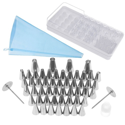 – Opakowanie: 57 elementów (52 tylki, 1 x adapter, 1 x rękaw cukierniczy, 2 x pinezka do kwiatków, pudełko)