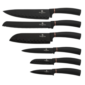 Zestaw noży BH-2337 ze stali nierdzewnej dodatkowo pokryte powłoką nieprzywierającą non-stick. Wyposażone w uchwyty pokryte bardzo trwałą cienką warstwą silikonu dla uzyskania pewnego trzymania w każdych warunkach. Całość znajduje się w efektownym pudełku kartonowym z wytłoczką z pianki, zamykana na magnes. Noże pasują do serii naczyń z serii BLACK ROSE / ROSE GOLD.