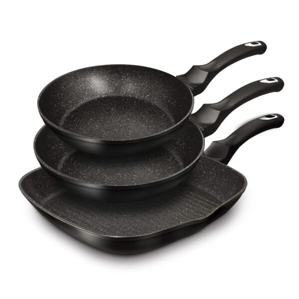Zestaw patelni BH-6157 wykonane są z wysokiej klasy kutego aluminium pokrytego wewnątrz potrójną powłoką granitową (marble) o bardzo wysokim współczynniku twardości.
